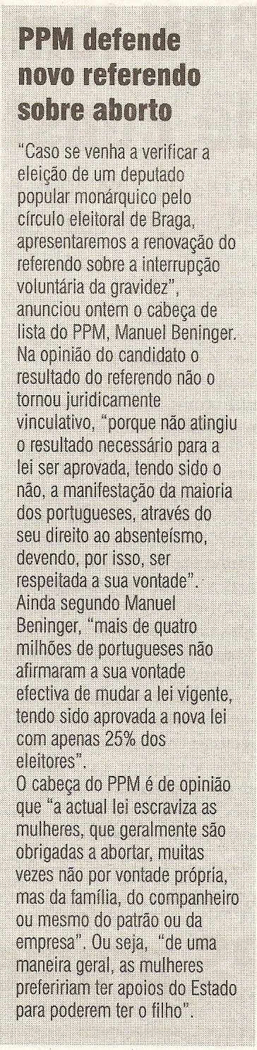 “Caso se venha a verificar a eleição de um deputado popular monárquico pelo círculo eleitoral de Braga, apresentaremos a renovação do referendo sobre a interrupção voluntária da gravidez”, anunciou ontem o cabeça de lista do PPM, Manuel Beninger.