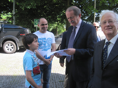 Sua Alteza Real recebe uma oferta de um jovem. À direita Luís Damásio, presidente da Real Associação de Braga.