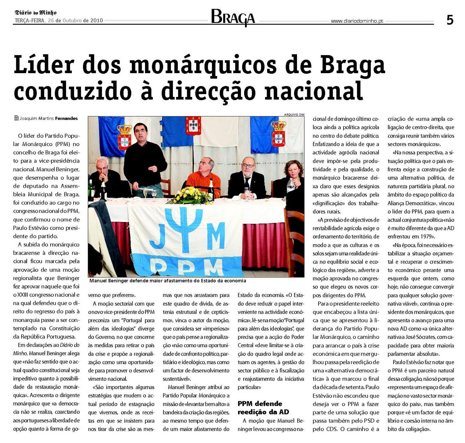 O líder do Partido Popular Monárquico (PPM) no concelho de Braga foi eleito para a vice-presidência nacional. Manuel Beninger, que desempenha o lugar de deputado na Assembleia Municipal de Braga, foi conduzido ao cargo no congresso nacional do PPM, que confirmou o nome de Paulo Estêvão como presidente do partido.