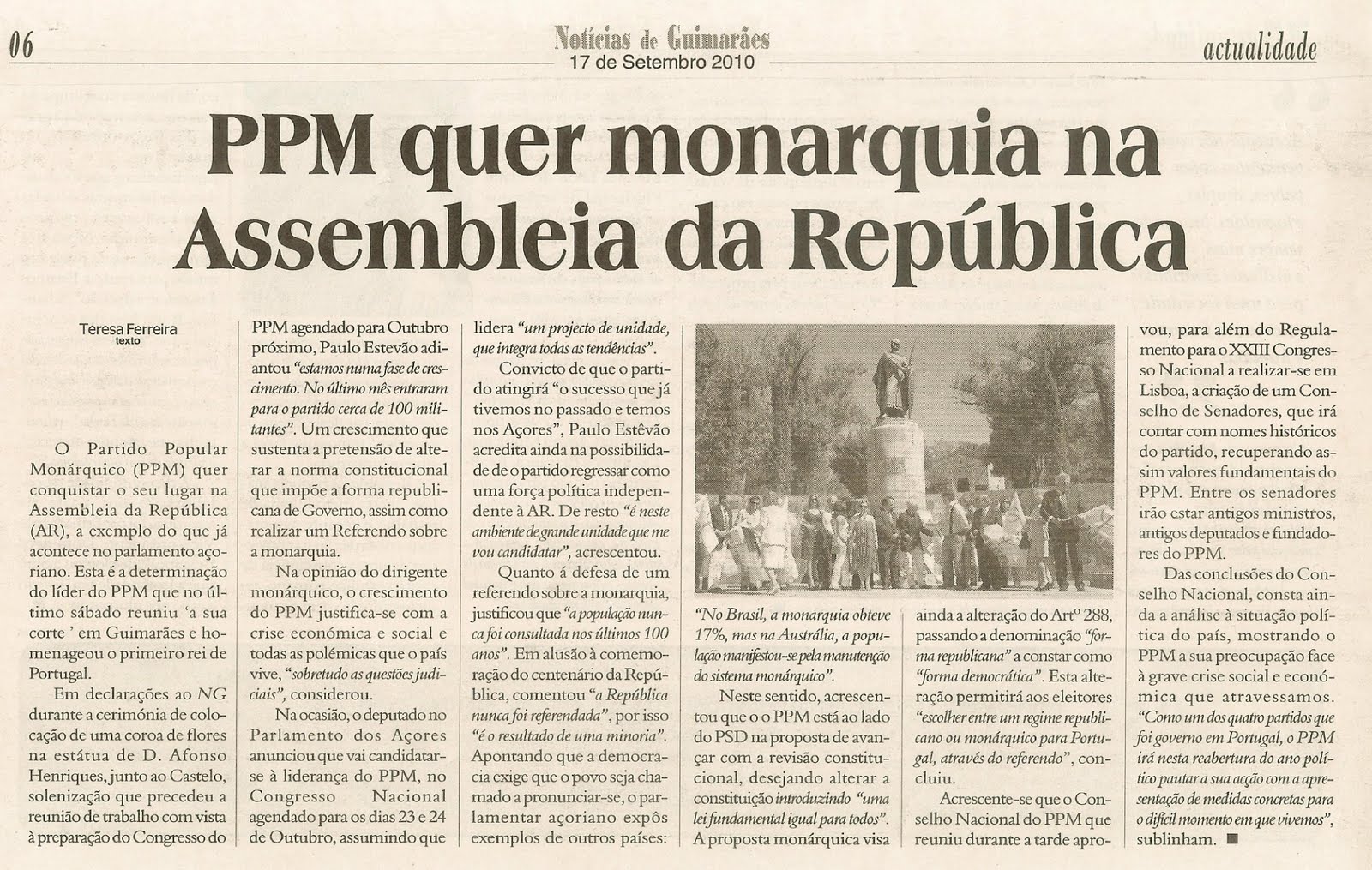 O líder do PPM assegurou, ontem, em Guimarães, que o partido monárquico está a crescer e a conquistar a simpatia de cada vez mais populares. “Estamos numa fase de grande crescimento. No último mês entraram para o partido cerca de 100 militantes, o que significa um crescimento explosivo. Isto tem a ver com a crise económica e social e todas as polémicas que o país vive, sobretudo as questões judiciais. Há uma forte descrença e um acentuado descontentamento da população na situação actual. E há novamente um grande entusiasmo pela questão monárquica”, sublinhou Paulo Estêvão, ontem, à margem do Conselho Nacional e após a colocação de uma coroa de flores na estátua de D. Afonso Henriques, homenageando assim o fundador de Portugal. Enfatizando que “estamos a crescer bastante”, o dirigente apontou o desejo de, tal como nos Açores, “conquistar o nosso lugar na Assembleia da República, em coligações”.