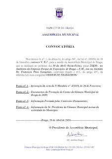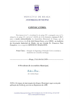 Hoje dia 23 de Abril (Sexta-feira), pelas 21:30h, no auditório da Associação Industrial do Minho, vai reunir, pela primeira vez desde o 25 de Abril, uma Assembleia Municipal Extraordinária em Braga, requerida por todos os grupos municipais da oposição (PSD, CDS.PP, CDU, BE e PPM) e contra a vontade do Partido Socialista.